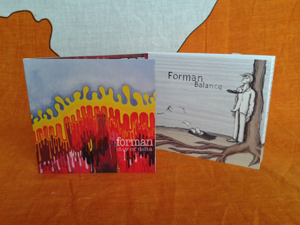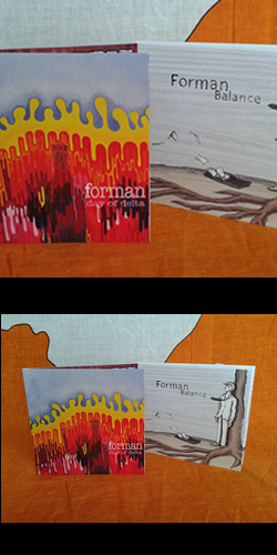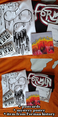 Perfect kit for being stranded on a desert island. Contains both studio CD's, two t-shirts, a random 11x17" flyer from Forman's History Bin, stickers, a handful of Forman postcards, and a mystery item from Forman history.